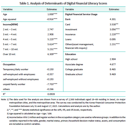 To identify the factors influencing digital financial literacy and to assess vulnerable groups, this article analyzes data from the 2025 Survey on Digital Financial Usage conducted by the Korea Financial Consumer Protection Foundation. Digital financial literacy is measured across three domains—knowledge, attitudes, and behaviors—following OECD guidelines. The survey consists of five questions on behavior, three on attitudes, and seven on knowledge. The behavioral domain assesses security-related practices in the use of digital financial services, such as password management and verifying whether an online provider is a licensed financial institution before subscribing to its services. The attitudinal domain captures perceptions of financial transactions conducted over public Wi-Fi networks, the degree of caution exercised prior to financial transactions, and the extent to which users review terms and conditions when using online financial services. The knowledge domain includes questions on the legal validity of digital financial contracts, understanding the similarities between online and offline financial services, and basic knowledge of virtual assets.