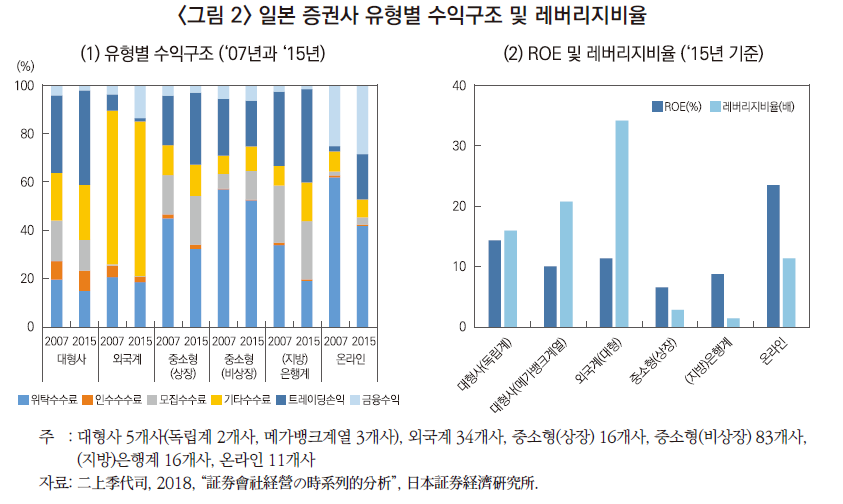 일본 증권사를 유형별로 구분하면 크게 대형사(독립계와 메가뱅크 계열), 외국계, 중견·중소형사, 지방은행 계열, 온라인 증권사 등으로 구분된다. 2007년과 2015년 수익구조를 유형별로 구분한 아래 그림에 따르면 위탁수수료의 비중이 감소하면서 트레이딩손익과 기타수수료의 비중이 커졌음을 확인할 수 있다.4)