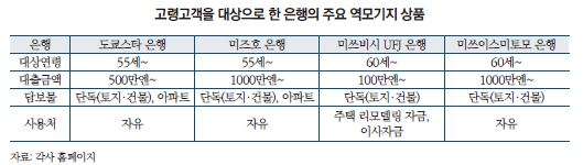 ─ 역모기지는 고령고객이 보유한 주택을 담보로 차입하여 매월 일정금액을 연금형식으로 받는 상품으로 1999년 6월 쇼쿠산 은행에서 처음 출시하였으며 2012년 이후 대중적인 노후상품으로 자리잡음17)