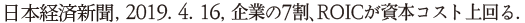• 도쿄증권거래소는 2018년 상장기업의 기업지배구조 코드를 개정하여 자사의 자본비용 파악을 요구17)하고 있으며 이를 계기로 ROIC를 도입한 기업의 증가, 일본경제신문에 따르면 WACC(가중평균자본비용)를 상회하는 ROIC 상승을 목표로 한 기업은 전체의 약 70%로 추정18)