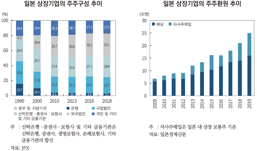• 신탁은행, 보험사, 증권사 등의 국내 기관투자자와 외국법인인 해외 기관투자자의 주주구성비율의 합은 1990년 33.7%에서 2018년 57.9%로 증가하였으며 이는 주주총회에서 상당한 영향력을 행사할 수 있는 수준