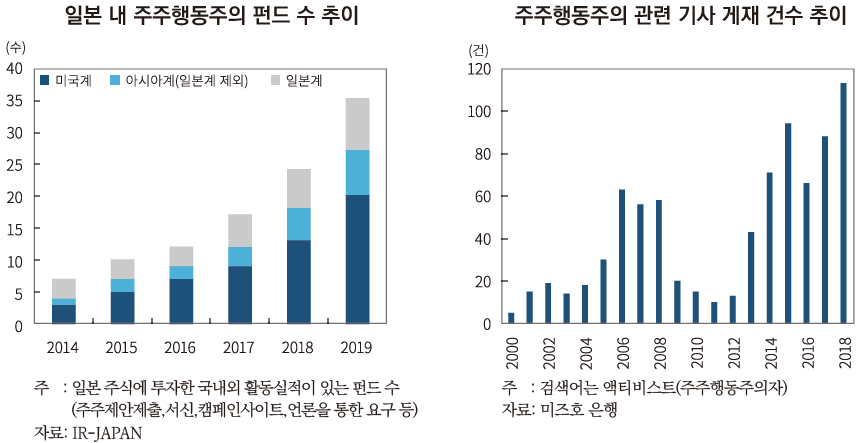 ─ 2019년 글로벌 주주행동주의 펀드는 일본 58건에 비해 국내는 6건으로 상대적으로 확산되지 않은 편19), 일본의 예처럼 기업지배구조 개선, 주주가치 향상을 위한 제도적 기반과 여론이 형성되면서 국내에 진출하는 사례가 늘어날 것으로 전망