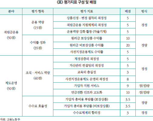 퇴직연금사업자 평가는 상기 표와 같이 정량적 지표와 정성적 지표로 구성된다. 법정 의무화 이후 일부 항목의 추가와 배점 조정 같은 미세조정이 있었으나, 전체적인 구조와 방향성은 그대로 유지되고 있다. 퇴직연금제도에서 현행 퇴직연금사업자의 역할을 감안하여 전체 평가항목을 ‘적립금 운용’과 ‘제도 운영’으로 구성하고 있다. 이에 대한 배점은 현재 50:50으로 설정되어 있으나, 이는 전술한 바와 같이 종합평가 중심의 평가 활용에서는 정부의 정책 방향에 조응하도록 적극적으로 배점이 조정될 필요가 있다. 적립금 운용과 제도 운영의 점수 비중은 퇴직연금사업자의 역할에서 중요도의 관점이 아니라, 평가를 통해 기대하는 사업자의 행태 변화의 관점으로 설정되어야 한다.