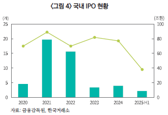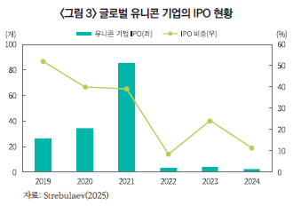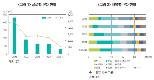 ・2025년 들어서도 상반기 글로벌 IPO 건수는 539건에 그쳤으나 조달 금액은 614억 달러로 전년 동분기 563건, 527억 달러 대비 건수는 감소하고 금액은 약 16.5% 증가