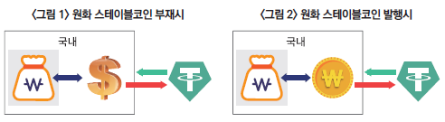원화 스테이블코인 도입시 외자유출2) 가능성을 원화 스테이블코인의 도입 이전과 이후로 구분하여 살펴보면 다음과 같다. 우선 원화 스테이블코인이 부재한 현재에는 국내에서 달러화기반 스테이블코인(예: 테더(USDT))에 대한 수요가 증가하면 테더와의 교환과 국내 공급이 미달러화를 대가로 이루어진다. 해외의 테더 매도자는 궁극적으로 코인에 대한 대가를 미달러화로 수취하고자 하기 때문이다. 즉, 거주자가 테더를 취득하는 과정에서 원화와 미달러화의 환전이 일어나고 미달러화는 다시 테더와 교환되므로 외자유출 가능성이 존재한다.