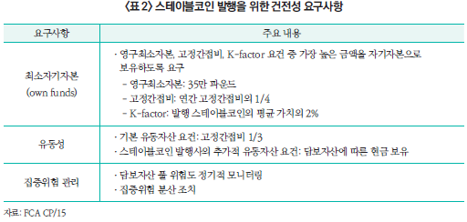 □ FCA의 규제안은 스테이블코인을 ‘화폐와 유사한 수단’으로 간주하고 소비자 보호에 중점을 두고 설계하였으며, 이는 결국 금융시스템 안정성에 기여할 수 있을 것으로 평가