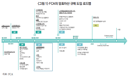 ・FCA는 일거에 모든 것을 규제하지 않고 단계적으로 규율 범위를 확대하는 전략을 취하여 우선적으로 스테이블코인 발행과 수탁 서비스를 감독망에 편입하고 이후 거래소, 중개, 대출, 스테이킹, 영업행위 일반 등으로 규제를 확장할 예정이며, 향후에는 영란은행(BoE) 규제 하의 결제 시스템으로의 점진적 통합을 추구