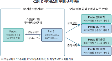 이자율스왑(Interest Rate Swap: IRS)은 정해진 통화의 계약금액에 대해 서로 다른 이자를 교환하는 파생상품으로, 일반적으로 고정금리(스왑금리) 이자와 변동금리 이자를 교환하는 구조이다(<그림 1>).6) 현재 원화(KRW) 이자율스왑의 변동금리 준거금리로 대부분 CD수익률이 사용되고 있다. 이자율스왑의 계약 체결 이후 스왑금리 변화에 따라 거래당사자 간 손익이 발생한다. 변동금리를 수취하는 part A는 계약 이후 금리가 상승하면 미래에 받을 변동금리 기대 이자 가치가 커지면서 평가이익을 얻게 되고, 반대로 금리가 하락하면 평가손실을 입게 된다(<그림 1>). 따라서, CD 이자율스왑은 FRN이나 대출의 CD수익률을 고정금리로 헤지하는 용도7)로 활용되기도 하지만, 주로 다양한 금리의 변동에 대한 투자나 금리위험관리를 목적으로 사용되면서 시장이 크게 성장하였다.