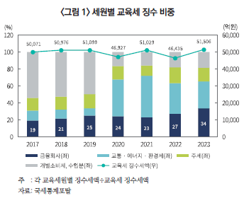교육세법 제5조 제3항과 시행령 제4조 제1항에서 과세표준으로 규정하고 있는 수익금액 항목들은 각각 독립적으로 과세되고 항목 간 손익통산이 제한되는 구조로 되어 있다. 이로 인해 순손실이 발생한 경우에도 수익이 있는 한 교육세가 부과되어 조세부담의 불균형이 발생할 수 있다. 실제로 교육세 징수세액의 세원별 비중 추이를 보면, 금융회사의 교육세 징수세액 비중은 2017년 19%에서 2023년 34%로 지속적으로 증가하는 추세임을 볼 수 있다(<그림 1>).
