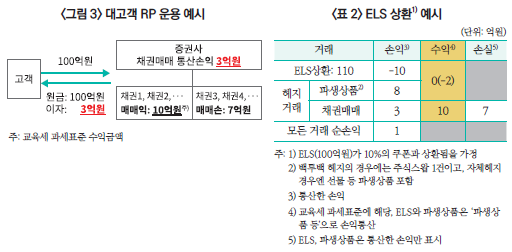 증권사는 투자자의 수요에 따라 다양한 금융상품을 공급하는데, 예금과 같은 수익구조인 대고객 RP(CMA RP를 포함)와 투자상품인 파생결합증권이 대표적이다. 상품 판매로 조달한 자금을 운용하기 위해 증권사는 채권을 매입하며, 이를 기반으로 활발한 매매를 통해 채권시장에서 유동성을 공급하게 된다. 먼저 대고객 RP의 예시로 <그림 3>을 보면, 고객으로부터 받은 자금 100억원으로 신용등급과 만기가 다양한 채권들을 운용하여 얻은 통산손익 3억원을 고객에게 이자로 지급한다. 이 과정에서 채권 매매익(10억원)과 매매손(7억원)이 발생한다면,10) 통산손익 3억원이 아닌 매매익 10억원이 교육세 과세표준이 된다.