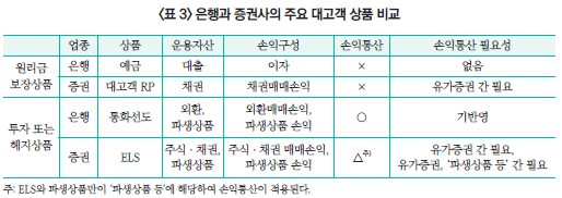 <표 3>은 증권사와 은행의 대표적인 대고객 상품과 운용을 비교한 표이다. 먼저 원리금 보장상품을 보면, 은행은 예금으로 조달한 자금을 주로 대출자산으로 운용한다. 대출자산의 경우 매매 없이 만기까지 이자수익만 발생하기 때문에 손익통산의 효과가 없다. 그러나 앞서 살펴본 바와 같이 증권사는 대고객 RP를 채권으로 운용하기 때문에 매매익과 매매손이 혼재되어, 유가증권 손익통산 여부에 따라 교육세에 큰 차이가 발생한다.
