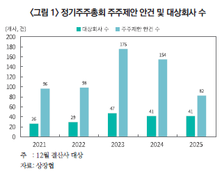 — 2025년 정기총회에서 주주제안이 상정된 기업은 총 41개사(유가증권시장 16개사, 코스닥시장 25개사)이며, 주주제안으로 상정된 안건 수(동일 의제 안건이 다수인 경우 1건으로 집계)는 82건으로 2024년 대비 46.8% 감소
