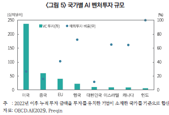 한국의 자본시장은 제한된 규모이지만 간접투자를 중심으로 AI 산업을 지원할 수 있는 역량이 성장하고 있으며 이를 지속가능하게 만드는 노력이 필요한 시점이다. 2024년 기준 AI 벤처투자는 전년 대비 75.1% 증가하였으며13), 2025년 1분기 기준 신규 결성 펀드의 83.5%가 민간 출자로 이루어진 점14)은 긍정적인 요소이다. 그러나 투자 규모 면에서 미국, 중국, 유럽과의 격차는 아직 클 뿐만 아니라 양적인 면에서 유사한 이스라엘, 캐나다와 비교해서 해외 투자를 유치한 비중이 낮은 현실(<그림 5>)에 주목할 필요가 있다. 이는 추가적인 성장 동력을 확보하기 위해서는 해외 공동펀드 등을 활용한 투자 협력에도 적극적으로 노력할 필요가 있다는 점을 시사한다. 나아가 민간의 후속 투자는 정책 펀드로 인한 구축효과(crowding out effect)를 제한하면서 경쟁력이 높은 산업에 대한 전략적인 지원을 강화할 수 있다15)는 점에서 지속적인 성장의 필요조건이라고 할 수 있다. 결론적으로 정부의 명확한 성장 전략 및 규율 체계, 자본시장을 통한 공공, 민간, 해외 투자 협력이 종합적으로 작용하여 글로벌 AI 경쟁력을 제고할 수 있을 것으로 기대한다.