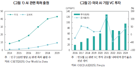 AI 산업을 선도하고 있는 미국을 보면 민간의 창의성과 자본시장의 역동성이 AI 개발과 활용 모든 면에서 가장 높은 수준의 경쟁력을 갖춘 원동력이 되고 있다. 고등교육기관과 실리콘밸리 등을 중심으로 결집한 우수한 R&D 자원은 혁신적인 AI 기술의 탄생 기반으로서 산업 발전의 기초가 된다. 미국 내 AI 관련 특허 출원 집중도가 세계 평균을 크게 상회하는 것에서 이와 같은 혁신의 기반을 확인할 수 있다(<그림 1>). 우수한 R&D 자원이 태동시킨 신기술은 자본시장의 지원을 기대할 수 있다. 미국 내 모험자본(VC) AI 투자 규모는 지난 10여 년간 매년 약 18%씩 증가하여 2024년에는 950억 달러를 초과하는 규모의 자금이 조달되었다(<그림 2>).