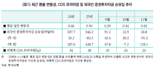 우선, 여러 우려에도 불구하고 최근 대외 건전성 지표들은 안정적인 모습을 보이고 있다. <표1>에서 나타나듯 원달러 환율이 상승세를 보이는 동안에도 변동성은 지난해 수준을 소폭 하회하고 있으며, 한국물 CDS 프리미엄이나 외국인 자금 동향 등 대외 신인도 지표에 별다른 이상 징후는 나타나지 않았다.2) 2025년 9월부터 11월까지 외국인 증권투자 자금은 월평균 47억 달러 순유입을 기록했으며, 외평채 CDS 프리미엄은 20bp대 초반 수준을 유지하며 안정세를 보였다.