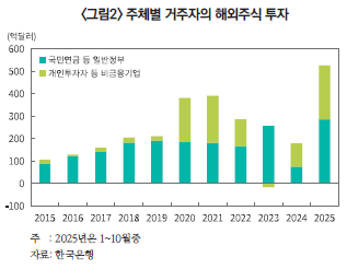 이러한 순환적 환경은 금년 중 AI 투자붐에 따른 미국 주식시장 투자 확대와 맞물리면서 단기적으로 환율 상승 압력을 증폭시킨 것으로 해석할 수 있다. 즉, 앞서 언급한 바와 같이 해외증권 투자는 중장기적으로 확대되는 추세(구조적 기저)가 존재하되, 특정 연도에는 민간의 위험선호와 환율 기대에 따라 변동 폭이 크게 확대될 수 있음을 시사한다. 실제로 <그림2>에서 나타난 바와 같이 2025년 1~10월 중 국민연금 등 일반정부와 개인투자자의 해외주식 투자는 2024년 연간 규모의 각각 3.8배와 2.3배에 달하는 이례적 수준으로 확대되었다. 즉 해외투자 확대라는 구조적 흐름 위에서 2025년에는 거주자의 해외투자가 단기간에 집중되며 달러 수요가 급증했고, 단기 수급과 기대를 통해 환율을 추가로 끌어올리는 요인으로 작용했을 가능성이 있다.