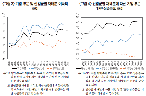 한편, 기업 부문의 TFP를 결정하는 또 하나의 핵심 축으로 기업 간 자원 배분의 효율성이 있다. 동일한 기술 수준과 생산요소의 총량 하에서도 자본과 노동 등 생산요소가 한계생산성이 낮은 기업에서 한계생산성이 높은 기업으로 원활히 재배분될 경우, 경제 전체의 산출량은 증가하며 그 결과 기업 부문의 TFP 역시 제고될 수 있다. 이러한 기업 간 자원 배분의 효율성은 경제 여건과 제도적 환경에 따라 달라질 수 있는데, 금융시장 마찰, 기업 퇴출 및 구조조정의 지연, 제도적 경직성 등은 생산성이 높은 기업으로의 자원 이동을 제약함으로써 기업 간 자원 배분의 효율성을 저하시킬 수 있는 요인으로 지적된다. 이와 같은 마찰이 지속될 경우, 생산성이 높은 기업은 성장 기회를 충분히 활용하지 못하는 반면 생산성이 낮은 기업에 자원이 잔존하는 구조가 고착화될 가능성이 있으며, 이는 기업 간 자원 배분의 비효율성을 누적·확대시켜 기업 부문 TFP 성장세를 제약하는 구조적 요인으로 작용할 수 있다.