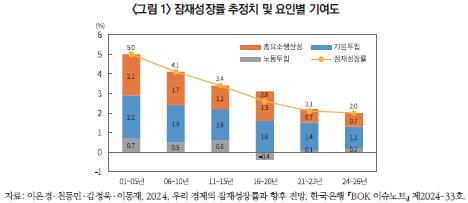 우리 경제는 장기간에 걸친 총요소생산성(Total factor productivity; 이하 TFP) 증가세 둔화와 잠재성장률의 추세적 하락이라는 구조적 문제에 직면해 있다(<그림 1>). 저출산‧고령화의 심화와 물적자본의 한계생산성 하락으로 인해 노동 및 물적자본 투입의 양적 확대에 기반한 성장은 점차 한계에 봉착하고 있으며, 이러한 여건 속에서 기업 부문의 생산성 제고는 경제 전반의 성장 잠재력을 좌우하는 핵심 과제로 그 중요성이 더욱 커지고 있다. 그러나 기업 부문의 TFP 증가세마저 둔화되는 모습을 보이면서, 우리 경제의 성장세 둔화가 구조적으로 고착화될 가능성에 대한 우려가 확대되고 있다.