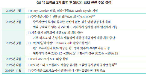 □ 트럼프 2기 행정부 출범 이후 SEC는 기존에 내렸던 주주제안이나 기후 공시 의무화 등 ESG관련 주요 사안들을 되돌리는 결정을 내리고 있음6)