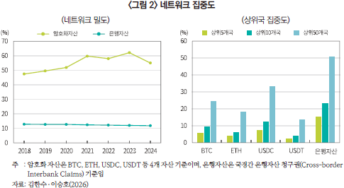 또한 암호화 자산의 국경간 거래는 국제거래 네트워크의 연결 밀도와 집중도 측면에서도 기존 금융자산과 뚜렷한 차이를 보인다. 국경간 거래의 방향성을 기준으로 한 네트워크 연결 밀도는 암호화 자산의 경우 50%를 상회하는 수준으로 은행자산 대비 현저히 높게 나타나며, 상위 5개 양방향 국가쌍 기준으로 측정한 네트워크 집중도 역시 전통적 금융자산보다 상대적으로 낮은 수준을 보인다.9) 이는 암호화 자산을 통한 국제 자금 이동이 기존 금융 구조보다 광범위한 국가 간에 분산적으로 연결되어 있으며, 국경간 거래가 특정 소수국에 집중되기보다는 다양한 국가군으로 분산되는 경향을 보이고 있음을 의미한다. 즉, 국제거래 네트워크의 구조와 자금 이동 경로가 전통적 금융자산과는 상이하게 전개되고 있으며, 이러한 특성은 암호화 자산의 국경간 흐름이 단순한 투자 목적의 변동성을 넘어 신흥국의 거시경제적 충격과 금융 접근성 격차를 조정ㆍ완충하는 새로운 형태의 국제금융 흐름으로 기능하고 있음을 시사한다.