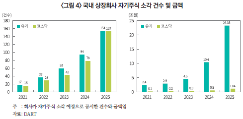 무엇보다 중요한 것은 기업의 자발적인 자기주식 소각을 통한 주주가치 제고 노력이다. 2024년부터 자발적 소각이 증가하는 추세인 만큼(<그림 4> 참조), 기업 스스로 자기주식 소각을 통해 주주가치 제고에 보다 적극적으로 나설 것이 요청된다.