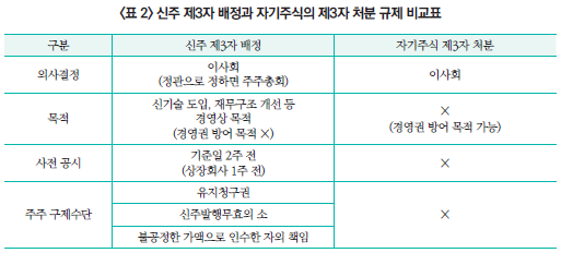2015년 개정 상법은 자기주식을 신주발행에 준하여 활용할 수 있도록 하였다. 자기주식의 처분은 경제적 관점에서 신주발행과 동일한 효과를 가지며, 주주 구성의 변화를 통해 기존 주주의 이익에 영향을 미친다는 점에서도 다르지 않다. 그런데 현행법상 신주발행과 자기주식 처분에 적용되는 규제의 강도는 현저히 다르다. 신주를 제3자에게 배정하는 경우, 상법은 신기술 도입ㆍ재무구조 개선 등 경영상 목적을 엄격히 요구하고, 사전 공시와 주주의 유지청구권 등 다양한 보호 수단을 보장한다. 반면 자기주식의 제3자 처분은 이사회 결의만으로 가능하며, 특별한 경영상 목적 없이도 지배권 방어 등에 활용될 수 있다. 이러한 규제 차익은 기업들이 신주배정에 적용되는 엄격한 규제를 우회하여 자기주식을 특정 이해관계자에게 처분하는 유인으로 작용한다.