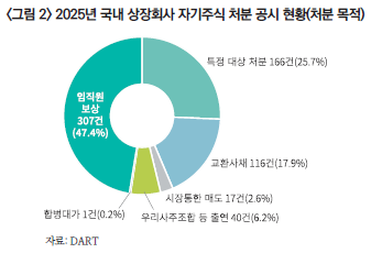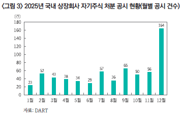 주목할 점은 자기주식 소각 의무화 법안의 통과 가능성이 높아지자 자기주식 처분이 급증했다는 사실이다. 2025년 12월 한 달에만 164건의 자기주식 처분 공시가 이루어졌는데, 이는 연간 전체 공시의 25.3%에 해당하는 수치이다.3) 특히 12월 중 특정 대상 처분 비중은 55.5%로, 연간 평균(25.7%)의 2배를 상회하였고, 교환사채 발행도 23건이나 있었다. 이는 제도 변화에 앞서 자기주식을 지배권 안정 또는 승계 구조 정비에 활용하려는 유인이 상당하였음을 방증한다.