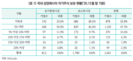 2025년 12월 말 기준 전체 상장회사의 약 66.2%인 1,723개사가 자기주식을 보유하고 있으며, 이 중 자기주식 비율이 10% 이상인 기업도 8.4%에 달한다(<표 1> 참조).