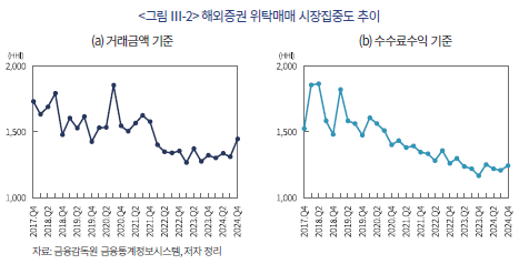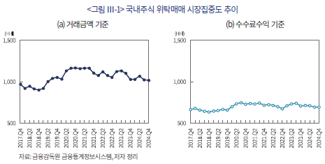 국내주식 위탁매매서비스시장의 경우 수수료수익 기준으로 계산한 시장집중도가 거래금액 기준으로 계산한 시장집중도보다 300~400 포인트 낮은 점도 특징적이다. 이는 거래금액 기준으로 시장점유율이 높은 대형 증권사들이 평균적으로 위탁매매 수수료율을 낮게 부과하였기 때문에 나타난 결과로 파악되며, 대형 증권사들이 상대적으로 가격 경쟁 압력을 더 많이 받는 것으로 풀이된다.
