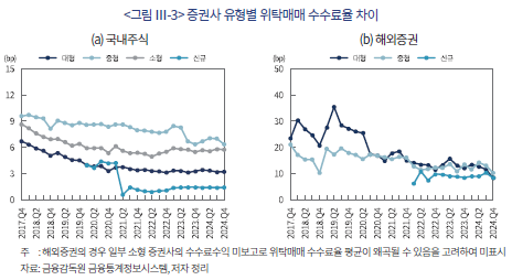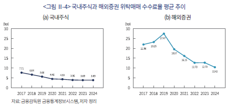 참고로 <그림Ⅱ-4>에 나타난 위탁매매 수수료율과 국내 증권사가 공시하는 위탁매매 수수료율은 큰 차이가 난다. 2025년 6월말 기준 공시 위탁매매 수수료율이 국내주식의 경우 최저 1.0bp이고, 해외주식의 경우 최저 20bp이다. 이는 국내주식의 경우 위탁매매 채널(지점, 전화, 온라인ㆍ모바일), 법인 여부, 계좌 개설경로(제휴 은행, 증권사 지점, 비대면)에 따라 수수료율을 차등하고, 대부분의 증권사가 한시적 수수료 이벤트를 반복적으로 진행해 왔기 때문이다.
