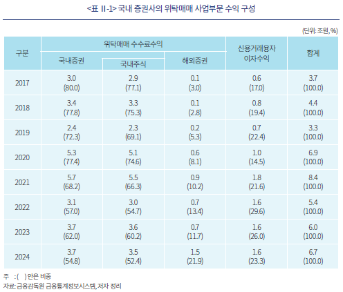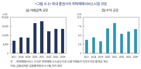 국내 증권사에게 위탁매매는 수익 측면에서 중요한 사업부문이다. 증권사 간 경쟁으로 위탁매매 수수료율이 지속적으로 인하되었음에도 위탁매매 사업부문은 증권사 전체 수익의 45% 내외를 유지하고 있다. 시장규모 확대에 대한 기대, 위탁매매서비스에 대한 수요 증가, MTS 도입, 비대면 계좌개설 허용 등 환경적ㆍ제도적 변화가 있을 때 증권사 간 경쟁이 치열해지는 것도 이 때문이다. 2024년에 미국주식이 대부분을 차지하는 해외증권 위탁매매 거래금액이 큰 폭으로 증가하자 2025년 초부터 약 14개 국내 증권사가 해외주식에 대한 무료 수수료 이벤트를 진행하는 것도 동일한 이유에서다.