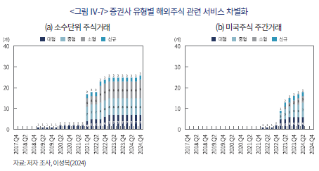 소수단위 주식거래 서비스는 <그림 Ⅳ-7>에 나타난 바와 같이 2019년 1개 증권사가 해외주식에 한하여 혁신금융서비스 지정을 받으면서 시작되었으며, 현재는 대형과 중형 전체, 소형 9개, 신규 2개 등 총 25개 증권사가 제공하고 있다. 국내주식 소수단위 주식거래 서비스는 2022년부터 시행되어 현재 6개 대형 증권사와 2개 중형 증권사만 제공하고 있다. 한편 일부 증권사들은 2023년부터 소수단위 주식거래 서비스를 활용하여 저축과 투자를 융합한 주식 모으기 또는 적립식 주문 서비스를 제공하기도 한다.