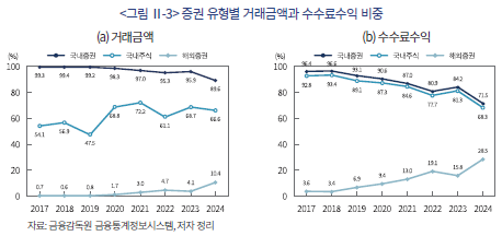위탁매매서비스시장을 증권 유형별 구성 측면에서 살펴보면 <그림Ⅱ-3>에 나타난 바와 같이 세 가지 변화가 두드러지게 관찰된다. 먼저 국내증권의 거래금액과 수수료수익 비중이 감소하였다. 2017년에 각각 99.3%와 96.4%로 절대적이었으나, 2024년에는 각각 89.6%와 71.5%로 감소하였다.
