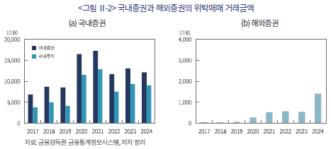 마지막으로 미국주식이 대부분을 차지하는 해외증권의 거래금액과 수수료수익 비중이 2024년 각각 10.4%와 28.5%에 달할 정도로 빠르게 증가하였다.