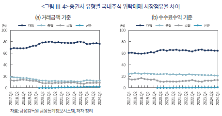 증권사의 시장점유율이 대개 가격 요인으로만 결정된다면 위탁매매 수수료율이 낮은 증권사일수록 더 높은 시장점유율을 보여야 한다. 그러나 <그림Ⅲ-4>에서 살펴볼 수 있듯이 증권사 유형별 시장점유율 추이를 비교해 보면 증권사의 시장점유율이 반드시 가격 요인에 의해서만 결정되는 것은 아님을 확인할 수 있다.