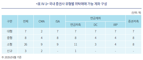 상품 다양성 측면에서 위탁매매 가능 계좌 구성을 증권사 유형별로 비교해 보면, <표 Ⅳ-1>에서 살펴볼 수 있듯이 대형 증권사의 경우 대부분 계좌 상품을 폭넓게 제공하고 있다. 중형 증권사의 경우 DC(Defined Contribution)와 IRP(Individual Retirement Pension)를 제공 중인 증권사가 전체의 50%인 4개사이고, 소형 증권사의 경우에는 종합계좌 외 다른 상품을 취급하는 비중이 50% 이하로 낮다. 신규 증권사는 ISA, DC, IRP를 취급하는 경우가 전무했고, 1개사만이 연금저축을 취급하고 있다.