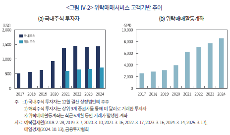 위탁매매서비스시장은 신규고객이 꾸준하게 유입되는 시장이기도 하다. <그림Ⅳ-2>에 나타난 바와 같이 2024년말 국내주식 투자자는 약 1,422만명(개인 1,409만명)으로 2017년 대비 917만명(개인 909만명) 증가하였다. 해외주식 투자자의 경우 2024년 8월말 기준으로 약 710만명에 달한다(매일경제, 2024. 10. 13). 위탁매매활동계좌는 2017년 2,567만좌에서 2024년 8,577만좌로 6,009만좌 증가하였다.