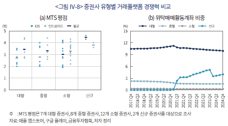 19) 코로나19 팬데믹 이후 20ㆍ30세대 중심으로 신규고객 유입이 대폭 증가한 점과 MTS 거래비중이 지속적으로 증가한 점을 고려하여 애플과 구글의 앱 스토어(app store)에서 제공하는 2025년 6월말 기준 MTS 평점을 활용하여 MTS에 한하여 증권사 유형별 거래플랫폼 경쟁력을 살펴보았다. 참고로 MTS의 거래비중은 2019년에 40.66%를 기록하며 HTS 거래비중을 초과하였고, 2021년에는 47.87%까지 증가하였다(IT조선, 2022. 6. 15).
