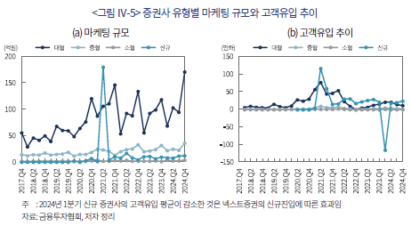 이 점을 고려하여 마케팅 규모를 마케팅비용으로 측정하여 증권사 유형별로 비교해 보면, <그림Ⅳ-5>에서 살펴볼 수 있듯이 2021년 2분기를 제외하고 대형, 중형, 신규, 소형 증권사 순으로 마케팅 규모가 평균적으로 크다. 또한 고객유입 추이를 분기별 위탁매매활동계좌 증감으로 측정하여 증권사 유형별로 비교해 보면, 신규 증권사의 시장진입 이전에는 대형 증권사의 고객유입이 압도적으로 컸으나 이후에는 신규 증권사의 고객유입이 대형 증권사를 대체적으로 상회하였다.