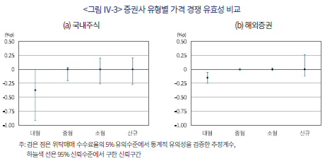 이를 살펴보기 위해 2017년 4분기부터 2024년 4분기까지 44개 국내 증권사의 패널 데이터로 위탁매매 수수료율이 평균적으로 낮을 때 증권사의 시장점유율 증가에 유의미하게 영향을 미쳤는지를 파악하기 위해 증권사 유형별 고정효과가 동일하다는 가정 하에 회귀분석을 실시하였다.10) 그 결과, <그림 Ⅳ-3>에서 살펴볼 수 있듯이 대형 증권사의 경우에만 위탁매매 수수료율이 시장점유율에 5% 유의수준에서 통계적으로 유의하게 영향을 미쳤고, 나머지 유형의 경우에는 통계적으로 유의하지 않은 것으로 나타났다. 대형 증권사의 경우 위탁매매 수수료율을 1bp 인하하면 국내주식 위탁매매서비스시장에서 시장점유율이 0.37%p, 해외증권 위탁매매서비스시장에서 시장점유율이 0.15%p 증가한 것으로 추정된다.