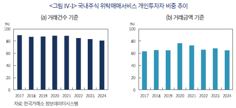 위탁매매서비스시장의 경쟁 환경적 특징 중 하나는 개인투자자 비중이 높다는 것이다. <그림Ⅳ-1>에서 살펴볼 수 있듯이 개인투자자 비중이 국내주식 거래건수 기준으로는 다소 감소하는 추세이나 80% 이상을, 거래금액 기준으로는 코로나19 당시에 최고점을 기록한 후 60% 이상을 차지하고 있다.