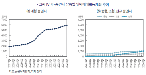 이처럼 위탁매매 수수료율이 대형 증권사의 시장점유율에만 유의미한 영향을 미친 것은 대형 증권사의 비가격 경쟁력이 상대적으로 우위에 있기 때문으로 판단된다. 이는 <그림Ⅳ-4>에 나타난 바와 같이 증권사 유형별 위탁매매활동계좌 추이로도 확인된다.