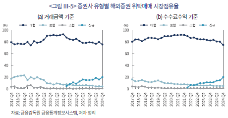 한편 해외증권 위탁매매서비스시장에서 증권사의 시장점유율에 미칠 수 있는 비가격 요인은 국내주식 위탁매매서비스시장에서와는 다른 것으로 판단된다. <그림Ⅲ-3>에서 살펴볼 수 있듯이 신규 증권사의 위탁매매 수수료율이 국내주식과 해외증권 위탁매매서비스시장 모두에서 다른 유형의 증권사보다 평균적으로 낮음에도 불구하고 해외증권 위탁매매서비스시장에서만 신규 증권사의 시장점유율이 빠르게 증가하였기 때문이다.