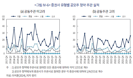 공모주 청약 주관 실적을 증권사 유형별로 비교해 보면, <그림Ⅳ-6>에서 살펴볼 수 있듯이 대형, 중형, 소형 순으로 주관 실적이 많다.17) 공동주관 여부를 고려하더라도 증권사 유형별 주관 실적 순은 동일하다. 참고로 2017년 4분기부터 2024년 4분기까지 공모주 청약은 총 772건으로 집계된다. 또한 신규 증권사가 공모주 청약 주관에 참여한 실적은 없는 것으로 파악된다.