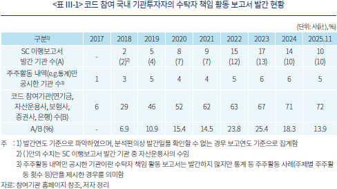 이러한 분석 결과를 종합하면, 코드 참여기관 수 대비 SC 이행보고서 발간 비율이 낮고 보고 주체도 일부 기관에 한정되어 있다는 점에서, 기관투자자의 스튜어드십 코드 이행 보고 수준이 전반적으로 미흡하다고 판단된다.
