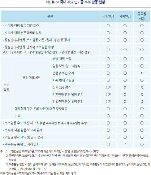 <표 Ⅱ-5>는 국내 연기금(국민연금, 사학연금, 공무원연금)의 수탁자 책임 활동 보고서를 바탕으로 연기금별 주주활동 현황을 정리한 것이다. 우선 한국 스튜어드십 코드 참여 연기금 모두 수탁자 책임 활동 지침을 마련하여 주주활동 수행의 근거를 마련하였다.22) 또한 수탁자 책임 활동 관련 주요 사항(수탁자 책임 활동 기준 제ㆍ개정, 주주권 행사 관련 사항 결정 등)을 검토ㆍ결정하고 수탁자 책임 활동을 총괄하는 수탁자 책임 전문위원회를 별도 기구로 설치ㆍ운영하고 있다. 국내 연기금은 주주 관여 활동 기준, 절차, 방법 등을 공개하고 있으며, 수탁자 책임 활동 보고서도 정기적으로 발간하고 있다.