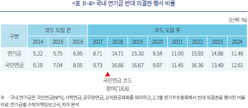 국민연금이 2018년 8월 스튜어드십 코드에 참여한 이후, 사학연금(2019년 12월), 공무원연금(2020년 2월)이 차례로 코드에 참여하였다. 스튜어드십 코드 참여 전부터 정기주주총회에서 연기금의 반대율은 국내 민간 기관투자자보다 높았으나, 코드 참여 이후 양자 간 반대율 격차가 참여 전 약 4.5%p에서 참여 후 최대 11.6%p까지 확대되었다. <표 Ⅱ-4>와 같이 국내 연기금의 반대 의결권 행사 비율은 코드 참여 전(’14년~’16년) 약 6%에서 코드 참여 이후(’17년~’24년) 약 12.7%로 2배 이상 증가하였음을 알 수 있다. 국민연금의 경우 코드 참여 전 정기주주총회 반대율이 9.73%였으나, 참여 직후 16.7%로 대폭 증가하여 이전보다 적극적으로 의결권을 행사한 것으로 판단된다.