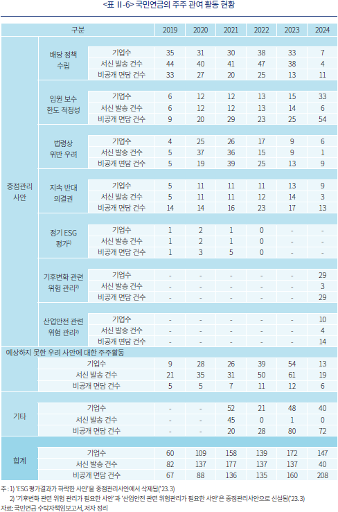 <표 Ⅱ-6>에 따르면, 국민연금은 2019년부터 2024년까지 연평균 131개 기업(중복 포함)을 대상으로 주주 관여 활동을 수행하였으며, 서신 발송과 비공개 면담 건수는 각각 연평균 118건과 132건으로 나타났다. 특히 비공개 면담 건수가 2019년 67건에서 2024년 208건으로 3배 이상 증가하였는데, 이는 임원 보수 한도의 적정성, 기후변화 및 산업안전 관련 위험 관리 이슈와 관련하여 국민연금과 기업 간 비공개 면담이 증가한 데 기인한다. 이를 통해 국민연금이 이러한 주요 이슈와 관련하여 기업과의 비공개 대화를 강화하고 있음을 확인할 수 있다.