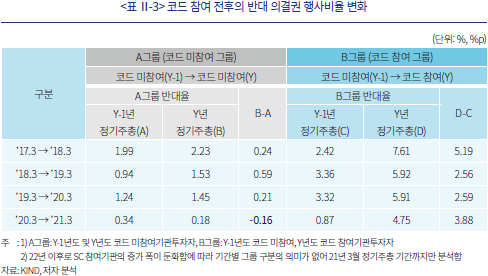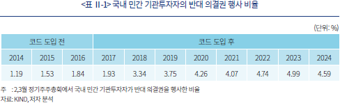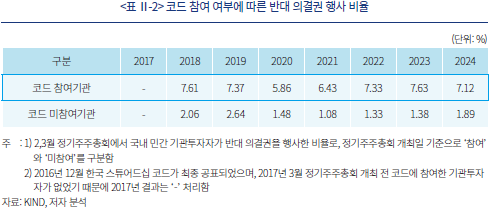 또한 <표 Ⅱ-2>에서 스튜어드십 코드 참여기관과 미참여기관으로 구분하여 분석한 결과, 코드 참여기관의 평균 반대율은 약 7%로 미참여기관의 약 1.7%에 비해 현저히 높은 수준을 보였다.