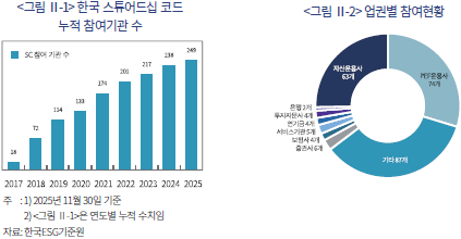 스튜어드십 코드 제정 이후 한국 스튜어드십 코드 참여기관 수는 2017년 18개 기관에서 2025년 11월 말 현재 249개 기관으로 지속적으로 증가하였다(<그림 Ⅱ-1> 참조). PEF운용사와 기타 기관을 제외한 업권별 분포를 살펴보면, 상대적으로 자산운용사가 차지하는 비중이 가장 높다(<그림 Ⅱ-2> 참조).